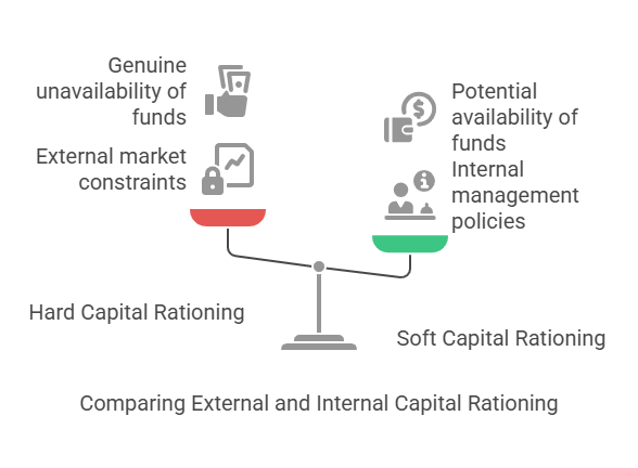 - Hard Capital Rationing (External Capital Rationing): This type occurs due to market constraints on the amount of funds available for investment during a period. The firm is unable to obtain funds from the external capital market due to external factors. External capital rationing mainly occurs on account of imperfections in capital markets. These imperfections may be caused by deficiencies in market information or by rigidities of attitude that hamper the free flow of capital. If shareholders do not have access to the capital markets, the standard NPV rule (accepting all positive NPV projects) may not work. This represents a genuine unavailability of funds from external sources like issuing equity shares, preference shares, debentures, or securing loans.