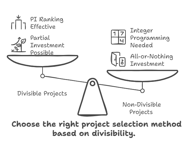 - Non-Divisible Projects: If projects must be accepted or rejected in their entirety (i.e., partial investment is not possible), simple PI ranking may not yield the optimal solution. Selecting projects strictly by PI might lead to a situation where the best combination of projects that fit within the budget involves skipping a higher-ranked project to take a lower-ranked one or a group of lower-ranked ones that collectively yield a higher total NPV. For non-divisible projects, the source mentions the application of Integer Programming as a technique. Integer programming is a mathematical optimization technique used to find the best combination of discrete choices (accept or reject each project) subject to constraints (the budget limit) to maximize an objective function (total NPV). This involves evaluating different combinations of projects to identify the one that maximizes the total NPV without exceeding the available funds.