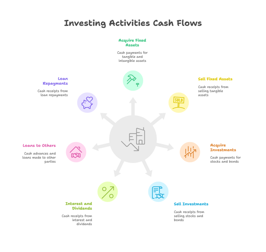 - Cash Flows from Investing Activities: These are cash flows resulting from the acquisition and disposal of long-term assets and other investments not included in cash equivalents. They represent the extent to which expenditures have been made for resources intended to generate future income and cash flows. Examples of cash flows from investing activities include: