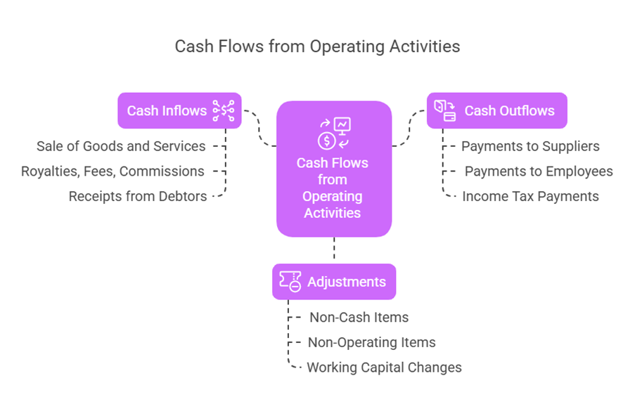 - Cash Flows from Operating Activities: These are the cash flows derived from the principal revenue-producing activities of the enterprise. They generally result from the transactions and other events that determine the entity’s net profit or loss. Examples of cash inflows from operating activities include: