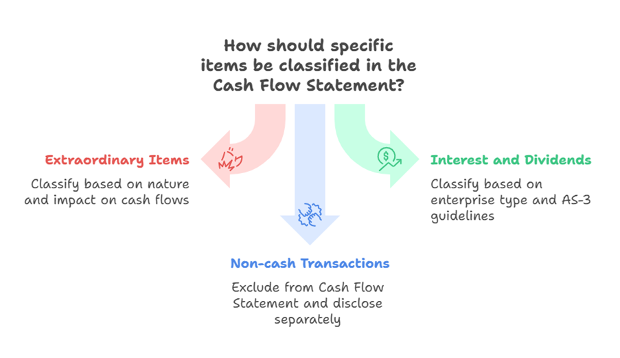 - Extraordinary Items: Cash flows related to extraordinary items should be classified as operating, investing, or financing as appropriate and disclosed separately to help users understand their nature and impact on cash flows.