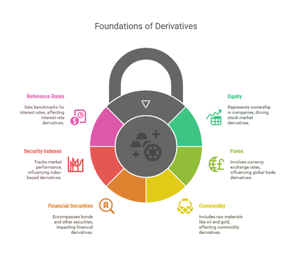 The underlying assets or bases for derivatives can be Equity, Forex, and Commodity. The underlying assets include financial securities, security indexes, reference rates, and some combination of them. They can also be tangible or intangible assets like an index or rates. Today, derivatives transactions cover a broad range of underlying assets including interest rates, exchange rates, commodities, equities, and other indices. In addition to agricultural commodities, there are futures for financial instruments and intangibles such as currencies, bonds and stock market indexes.