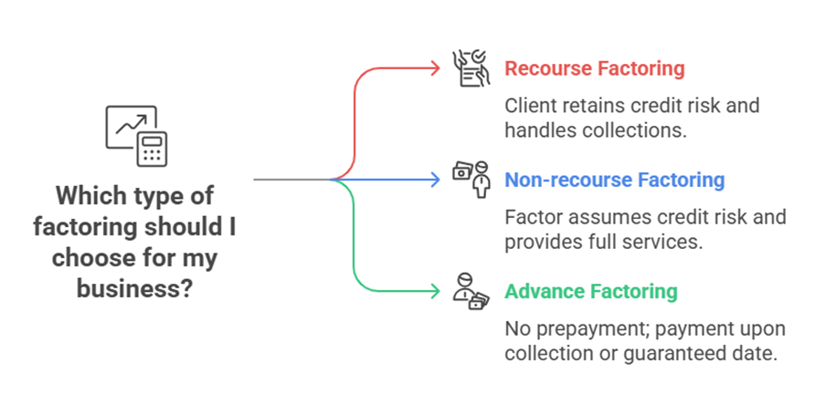 - Advance Factoring or Maturity Factoring: In this type, no advance or prepayment is made by the factor. Payment is made to the client either on a guaranteed payment date or on the actual date of collection from the customer.