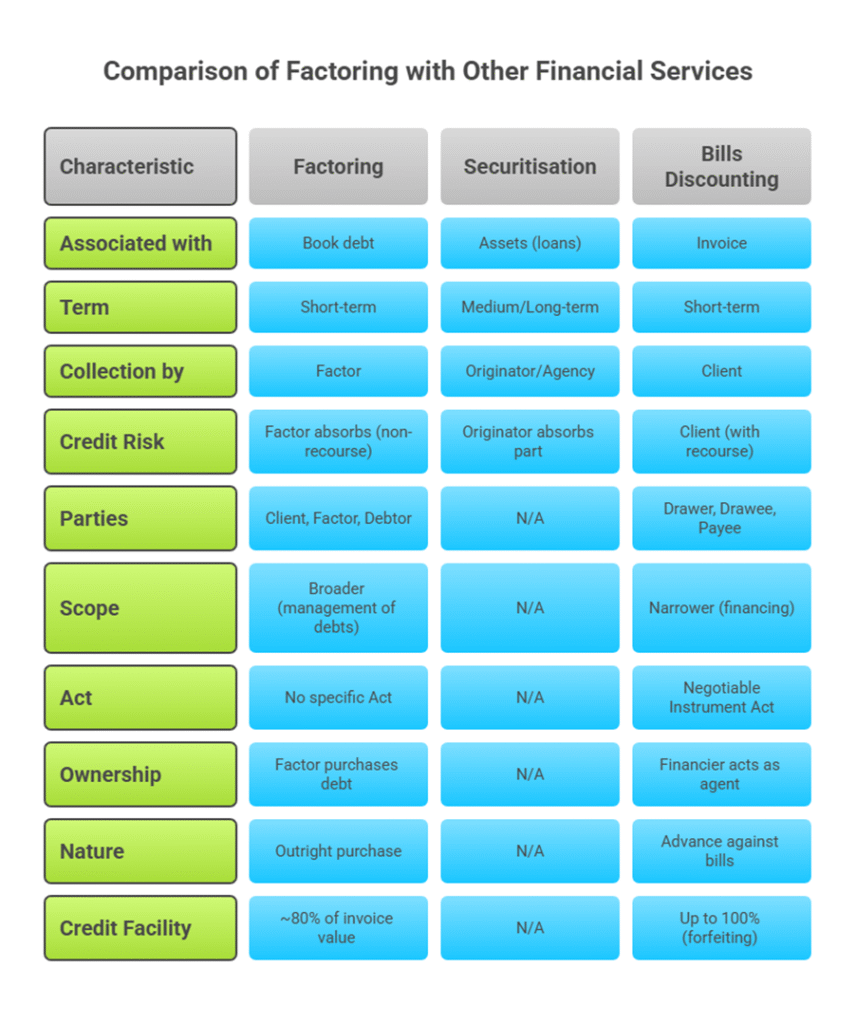 - Factoring vs. Securitisation: Factoring is associated with book debt and deals with bills receivable. It is typically short-term. Collection is usually done by the factor themselves. In non-recourse factoring, the factor absorbs the whole credit risk. Securitisation, on the other hand, is associated with assets (like loans), is medium or long-term, and collection is by the originator or an agency. In securitisation, only part of the credit risk may be absorbed by the originator.