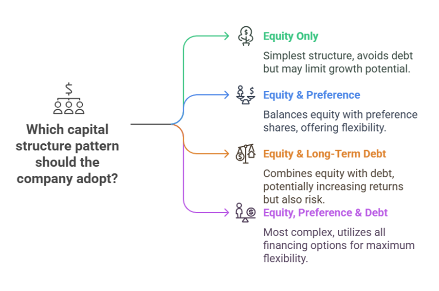Equity shares, preference shares and debentures (or Equity, preference and long-term debt): This is the most complex of the fundamental patterns, involving all three main types of long-term finance: equity shares, preference shares, and long-term debt instruments like debentures.