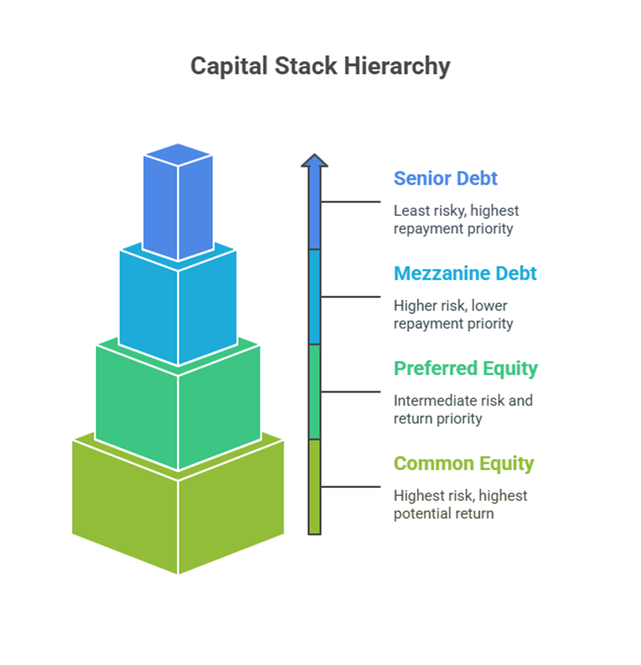 The concept of the “capital stack” provides a visual representation (like a pyramid) of the organization and hierarchy of the capital contributed to finance a venture or deal. Each level of the stack represents a different source of capital (both debt and equity) and indicates the priority of payouts and returns, as well as the associated risk and potential return. The levels, from bottom to top (least risky/return to most risky/return), are typically: