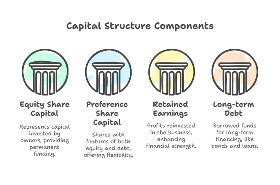 These components, particularly equity share capital, preference share capital, retained earnings, and long-term debt (such as debentures, bonds, and long-term loans), make up the mix that constitutes a firm’s capital structure used for permanent financing.