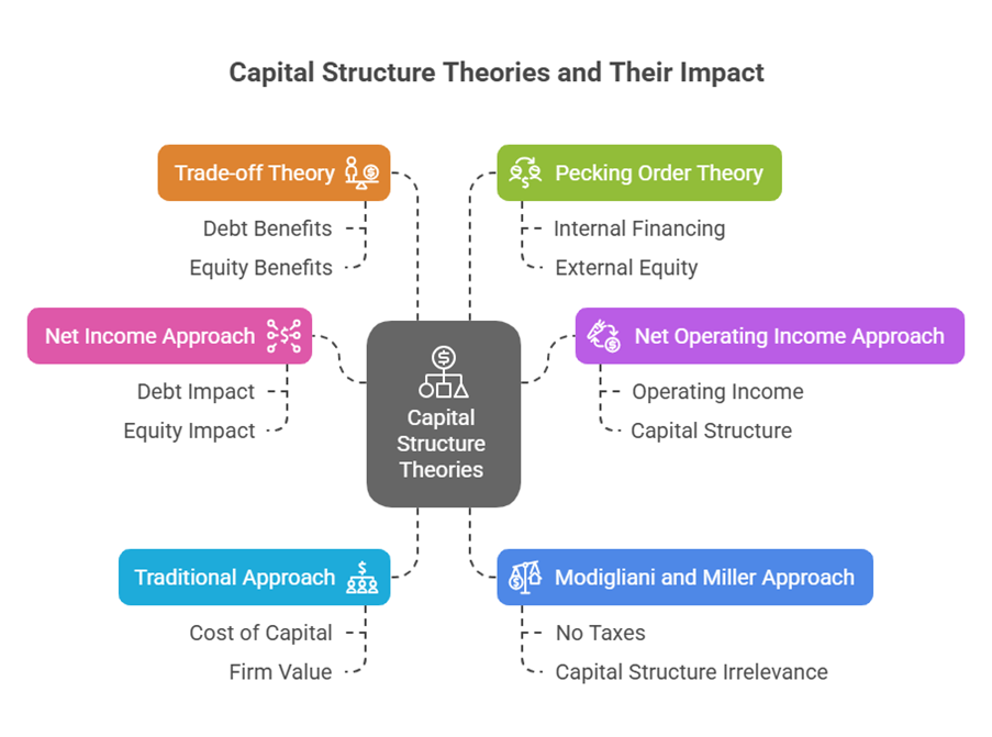 Various theories explore the relationship between capital structure, the cost of capital, and the value of the firm. These theories offer different perspectives on whether an optimal capital structure exists that can maximize firm value. The main theories mentioned are: