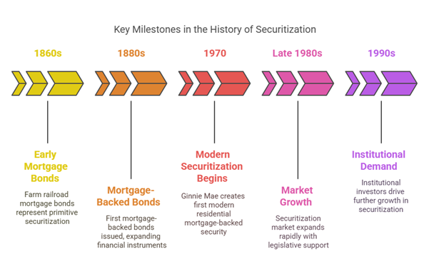 The concept of securitization, in its primitive form, dates back to farm railroad mortgage bonds in the 1860s and mortgage-backed bonds in the 1880s. However, the modern era of securitization began in 1970 with the creation of the first modern residential mortgage-backed security by the Government National Mortgage Association (Ginnie Mae or GNMA). This pooled mortgage loans and allowed them to be used as collateral for securities sold in the secondary market, aiming to channel investment capital for affordable housing.