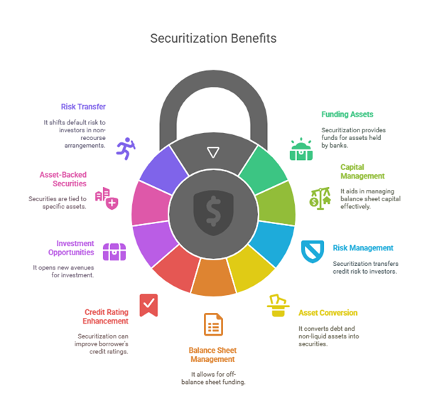 - Shifting assets from the balance sheet, allowing for off-balance sheet funding. This helps in better balance sheet management.