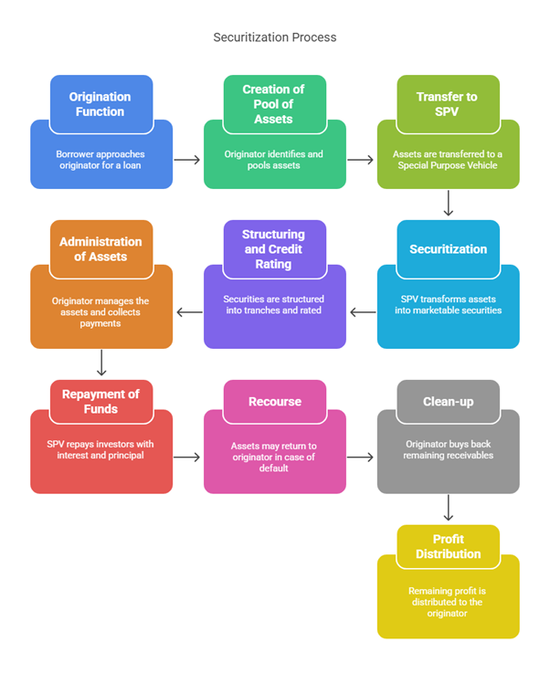 - Origination Function: The process begins with a borrower approaching a financial institution (the originator) for a loan, receiving debt in exchange for collateral.