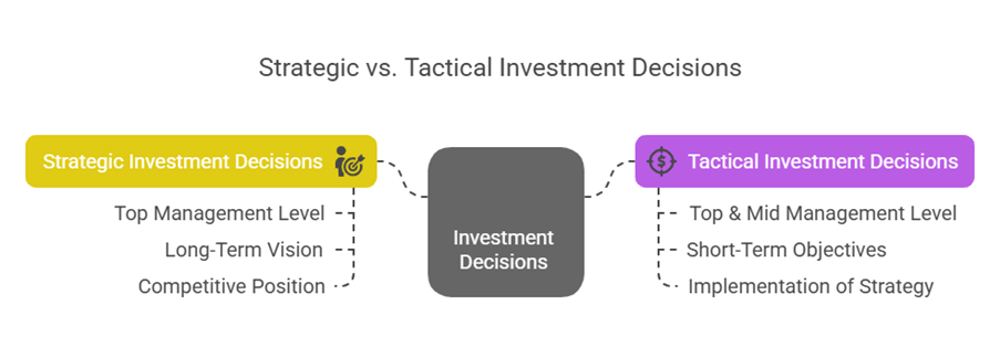 In summary, Strategic Investment Decisions are long-term, high-level decisions taken by top management, setting the direction and vision for the future of the organisation. Tactical Investment Decisions are intermediate steps, taken by top and mid-management, defining specific plans and means to achieve those strategic goals. Both are crucial aspects of long-term investment planning (capital budgeting), involving rigorous evaluation, risk analysis, and alignment with overall corporate strategy to maximize wealth.