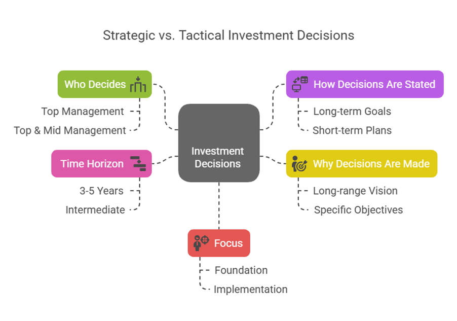 - Who decides: Strategic Investment Decisions are generally taken by Top Management, whereas Tactical Investment Decisions are generally taken by Top & Mid Management. Strategic planning is decided by Senior management, and tactical by middle level management.