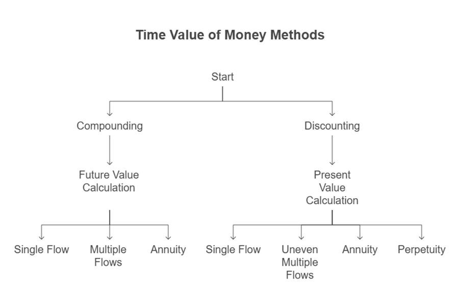 - Compounding (Future Value): This method is used to determine the value at some future point in time of a present amount of money or a series of payments. This value is calculated based on a given interest rate. Compounding essentially calculates how an investment grows over time by earning interest on both the initial principal and the accumulated interest from previous periods.