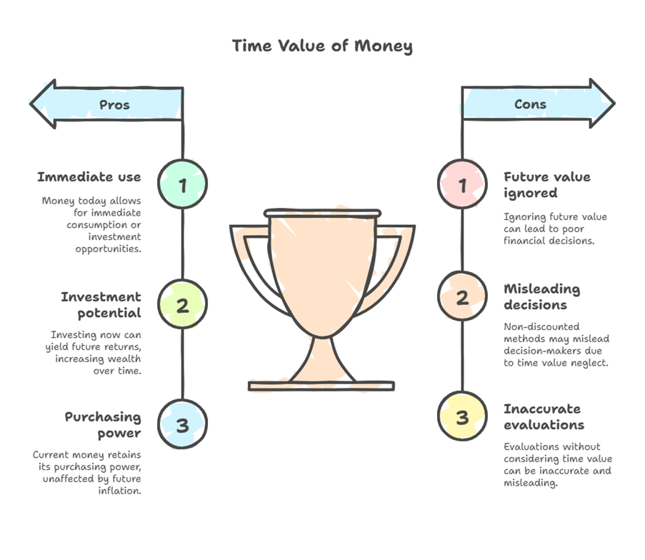 In summary, the time preference for money is a core principle in finance acknowledging that money has a higher value the sooner it is received due to factors like risk, consumption preference, and investment opportunities. This principle is quantified using techniques like compounding (for future value) and discounting (for present value), which are essential for evaluating cash flows occurring at different times across various financial decisions, including investment appraisal, financing, valuation, and working capital management. Non-discounted methods, by neglecting this principle, can lead to suboptimal decisions.
