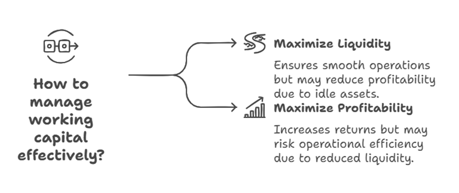 A key aspect of working capital management is the trade-off required between liquidity and profitability. While maintaining liquidity is important for smooth functioning, tying up funds unnecessarily in idle assets reduces liquidity and opportunity to earn better returns. The goal is to increase profitability without disturbing day-to-day functions.
