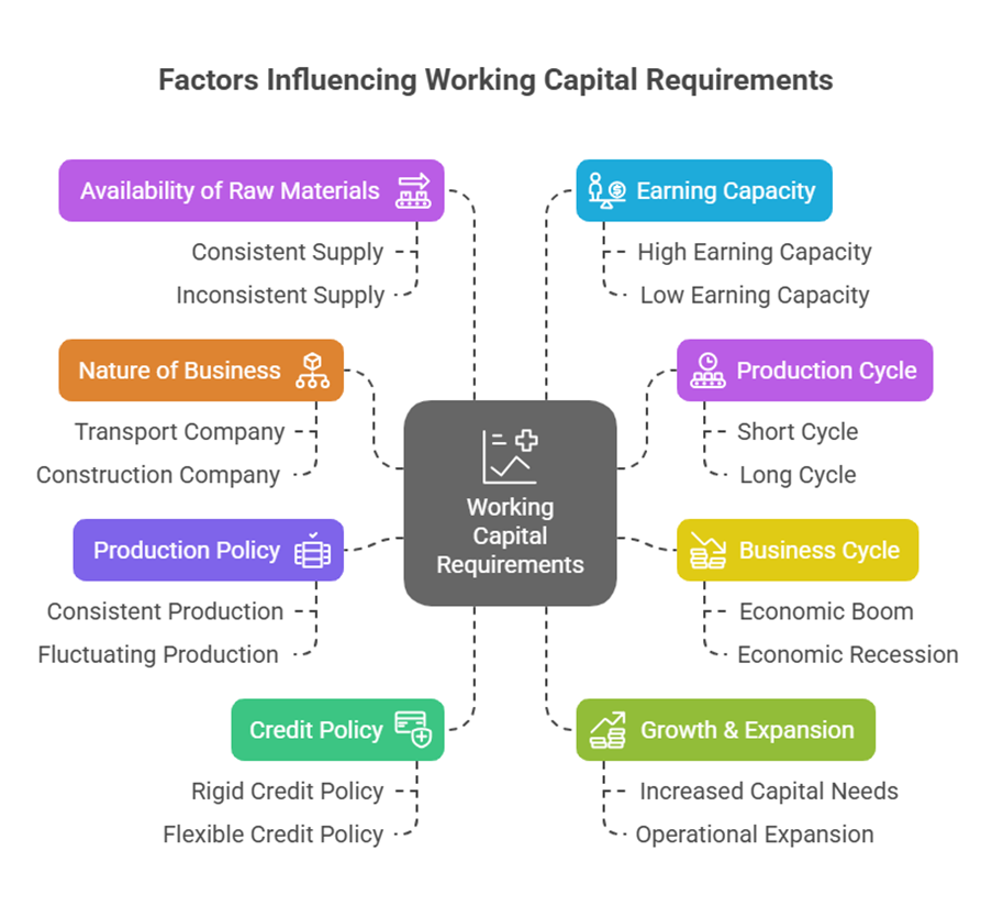 Working capital requirements are influenced by several factors, including: