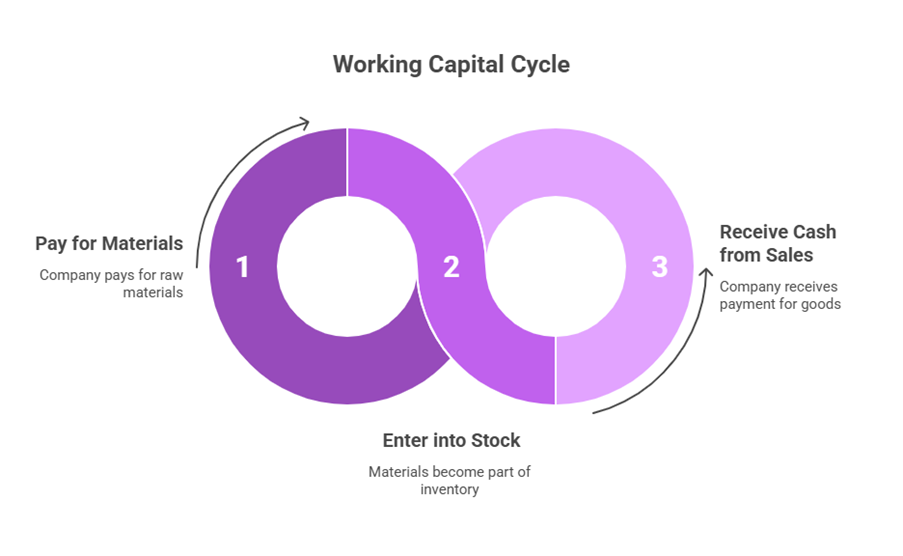 Also called the Operating Cycle or Business Cycle, the Working Capital Cycle indicates the length of time between a company’s paying for materials, entering into stock and receiving the cash from sales of finished goods. It is determined by adding the number of days required for each stage in the cycle.